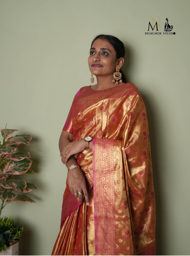 🌟 Indian Traditional Exclusive Kanjivaram Golden with Pink Floral Motifs Designer Saree | Unique Wedding Gift| Saree For USA| Navratri special 🌟